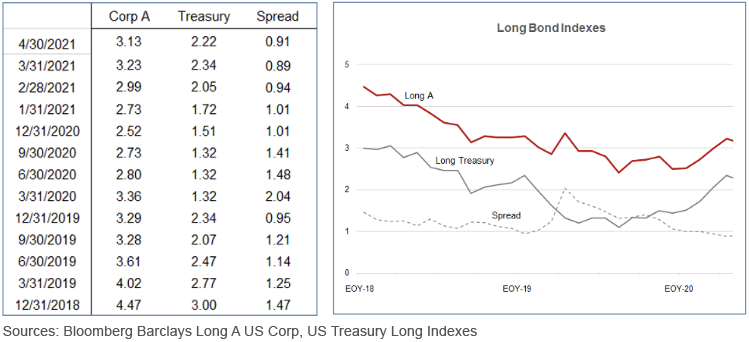 Long bond yields dropped about 10 basis points in April, following a series of yield increases in the first quarter. Even with the April drop, yields remain up over 60 basis points for the year. Recent yields remain low in historic terms, and most analysts expect low rates to continue below historic levels over the near term given the continuation of expansionary government monetary policy. Of course, long bond yields will also be impacted by inflation expectations and the demand for capital funds, both of which could be heading upward with a strong economy recovery in the context of recent monetary supply growth.