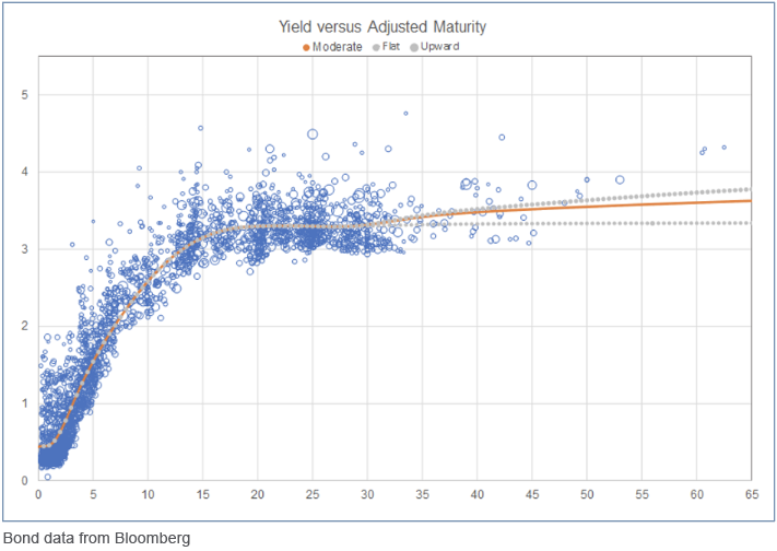 After filtering the A-grade bond universe for grading, optionality and other factors, the portfolio consists of roughly 2,600 bonds. These are arrayed across maturity groups; a curve is then fit to that array, with a goal of reflecting the mean/median yield for each maturity group. Note that two technical adjustments are made in the course of fitting the curve: