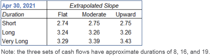 The variation in results based on the choice of extrapolation approach is less significant, ranging from 1 to 14 basis points depending on duration. (Obviously, a cash flow stream with a significant long tail will be more affected by the approach used to extrapolate long bond yields.)