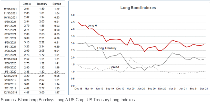 Long bond yields moved up 70–80 basis points in the first quarter of 2021, before giving up roughly half of that increase over the remainder of the year. Recent yields continue near historic low levels, and most analysts expect rates to remain low for the near term given the maturation of the economy and the continuation of at least some elements of expansionary government monetary policy. Of course, long bond yields are also impacted by inflation expectations and the demand for capital funds, both of which may be heading upward with a strong economy recovery in the context of recent monetary supply growth.