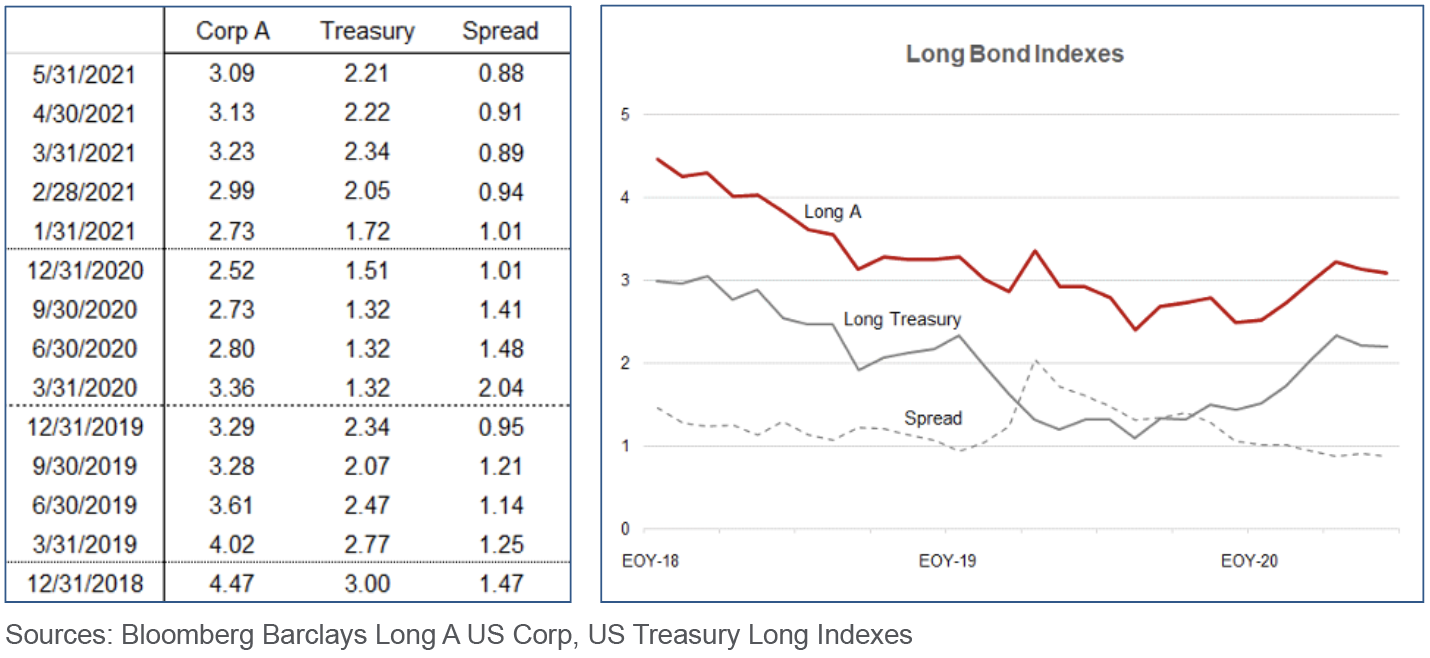 Long bond yields dropped slightly in May, the second monthly decrease following a series of significant yield increases in the first quarter. Long yields remain up about 60 basis points for the year. Recent yields remain low in historic terms, and most analysts expect low rates to continue below historic levels over the near term given the maturation of the economy and the continuation of expansionary government monetary policy. Of course, long bond yields will also be impacted by inflation expectations and the demand for capital funds, both of which could head upward with a strong economy recovery in the context of recent monetary supply growth.