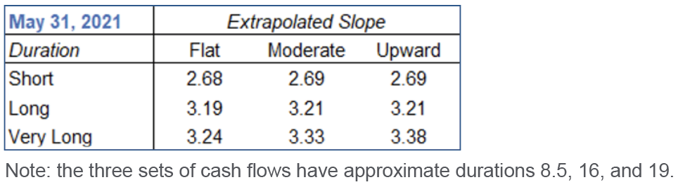 The variation in results based on the choice of extrapolation approach is less significant, ranging from 1 to 14 basis points depending on duration. (Obviously, a cash flow stream with a significant long tail will be more affected by the approach used to extrapolate long bond yields.)